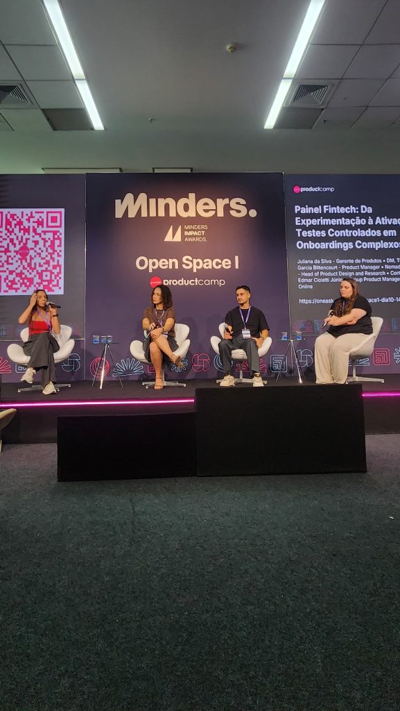O painel Fintech reuniu Juliana da Silva (DM), Edmar Cioletti Júnior (Remessa Online), Thais Bittencourt (Nomad) e Julia Candido (Conta Simples). Juntos, eles mostraram que experimentação em instituições financeiras não é inviável — apenas mais exigente.