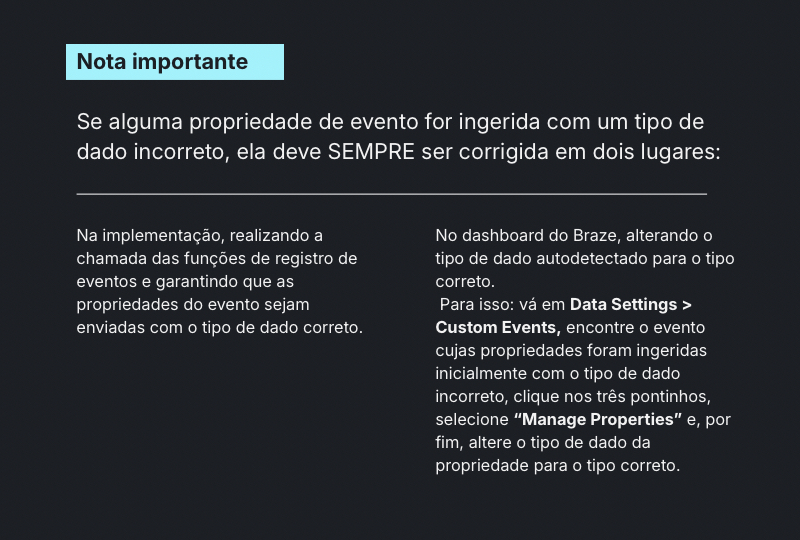 Garantir que os eventos personalizados e de purchase, junto com suas propriedades, cheguem com o esquema correto, sirvam para segmentação de audiências e disparem corretamente campanhas em Canvas e Campaigns. Sem eventos confiáveis, os triggers e a análise de comportamento não funcionam.